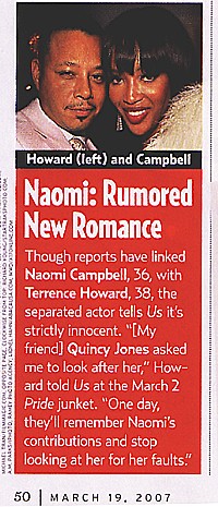 Though reports have linked Naomi Campbell, 36, with Terrence Howard, 38, the separated actor tells Us it's strictly innocent. "[My friend] Quincy Jones asked me to look after her," Howard told Us at the March 2 Pride junket. "One day, they'll remember Naomi's contributions and stop looking at her for her faults."